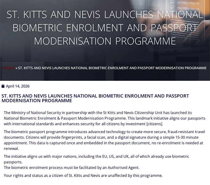 移投界讯:2026年4月14日,圣基茨和尼维斯启动了生物识别登记与护照现代化项目,5岁儿童及各年龄段成人均可报名。这一具有里程碑意义的举措使圣基茨护照符合国际标准,并提升了所有公民的安全。生物识别登记引入先进技术,打造更安全、防欺诈的旅行证件。包括提供指纹、面部扫描和数字签名。这些数据只需记录一次并嵌入护照文件中,续期时无需重新登记,生物识别注册流程必须由授权代理人协助。圣基茨和尼维斯公民的权利和身份不受该项目影响。